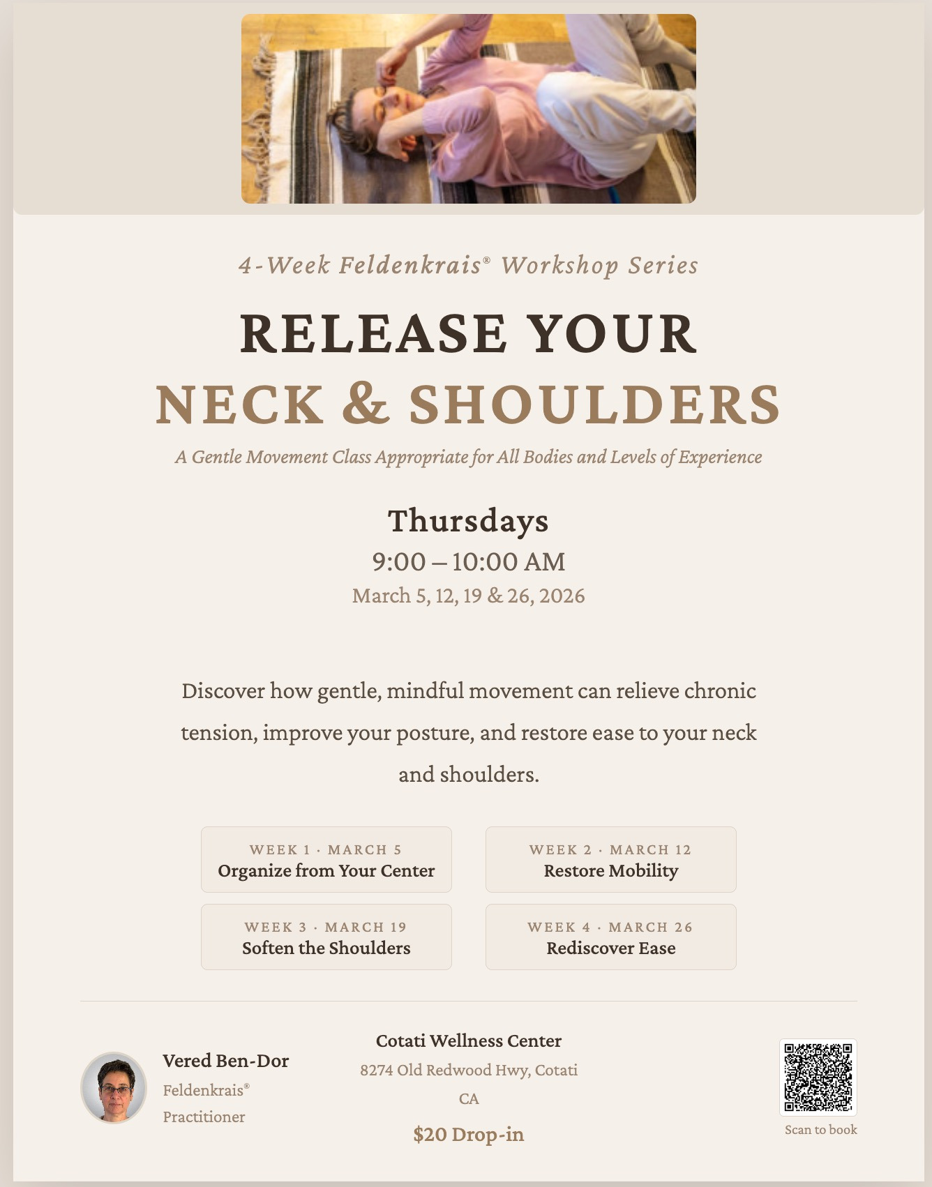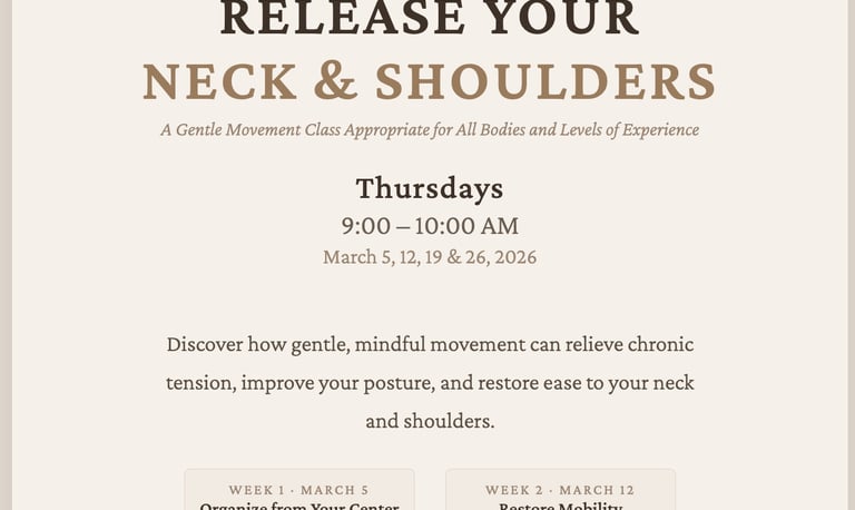 In-house Feldenkrais expert, Vered Bendor is here to lead you in an enriching 4-week workshop series designed to help release tension in your neck and shoulders. This gentle movement class is suitable for all bodies and levels of experience, making it the perfect environment for anyone looking to improve their physical well-being. Through the practice of mindful movement, you will discover how to alleviate chronic tension, enhance your posture, and restore a sense of ease in your neck and shoulders. Just $20/class; sign up today and embark on a journey to a more relaxed and adaptable you.